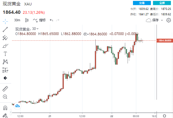 周三(7月22日),金价飙升至九年高点,原因是中美紧张局势加剧刺激了对安全资产的需求,而由于工业需求复苏的希望,银价追随黄金涨势创下近7年新高。 美市盘中,现货金突破1870美元关口,刷新2011年9月以来的高点至1870.25美元/盎司,较日低拉升逾30美元。 (现货黄金30分钟走势图) 经纪商O