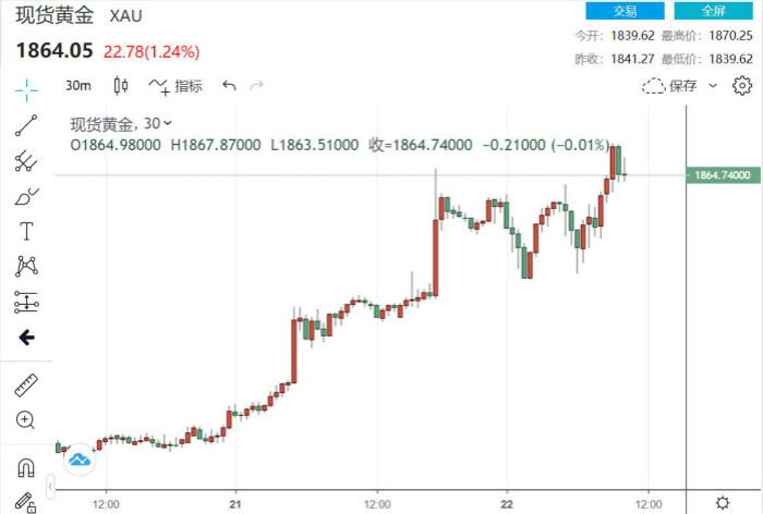 周三(7月22日),美国要求中国关闭驻休斯敦领事馆后,黄金和白银价格进一步上涨,因为这标志着两国之间的紧张局势进一步升级,并刺激了对避险资产的需求。现货黄金涨幅高达1.24%至1864.05美元/盎司,现货白银飙升7.39%至22.859美元/盎司。 (现货黄金30分钟走势图) (现货白银30分钟走势