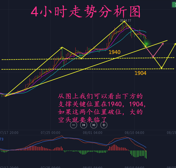 【黄金思路】 4小时连阴下挫后单阳反弹修正,此根阳线反弹的幅度有些大,一阳吞四阴。强行将弱势行情转换为震荡。而昨天反弹后进行了二次回测。今日如果突破1950高点则会进一步向上反弹1970-1980寻求阻力再回落。不过目前的结构。由于日线是平开。亚欧盘预计突破的机率较小,整体先会在1950下方震荡。下方则关注1906昨