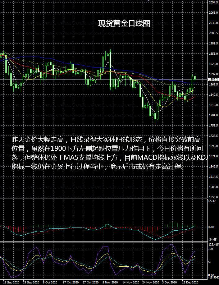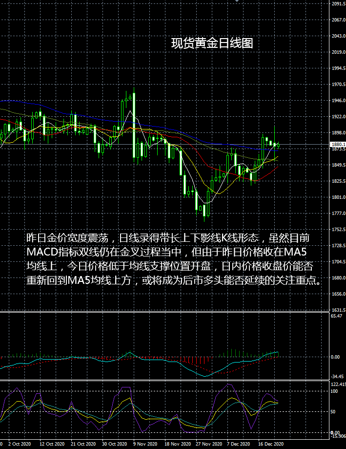 大田环球建议今日关注: 美国第三季度经常帐; 美国芝加哥联储主席埃文斯就新冠肺炎疫情后的恢复讲话。 压力:1890-1898-1910 支撑:1880-1875-1866 今日现货黄金行情操作建议: 1889-1890区间下看,目标1886-1882,风控3美元。 1880-1881区间上看,目标1885-1889,风控3美元。