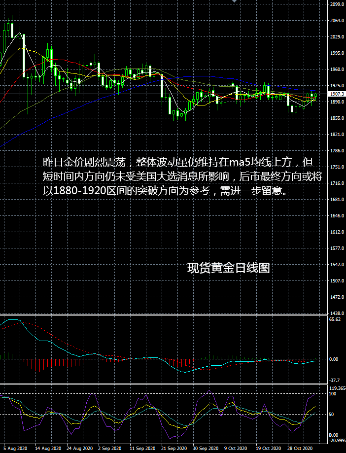 现货黄金市场行情现状简述:黄金现阶段继续保持相对稳定的温和上涨格局,不过本周的大选必然是重点所在,所以一切局势都会随时发生变化,短线可能暂时会在1900附近徘徊,要想走出明显突破难度较大。大选结果会在明天开始出炉大部分情况,届时根据占优情况将会对金融市场造成重大影响。 大田环球现货黄金