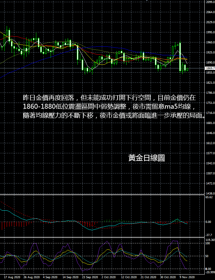 现货黄金市场行情现状简述:新冠疫苗试验成功导致的避险消散加上美国大选的消息逐渐被市场消化,昨天金价失去了上升动力。在多次未能成功击破日内多空分水岭1960一线位置后,价格开始转身回落,晚间更是在消息公布时出现大幅跳水的情况,大选以来的拉涨幅度已经被尽数收回,金价直接回到了九月下旬的低点位置