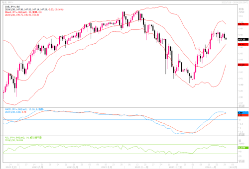 货币:美元/日元 周一(1月29日),美元兑日元下跌0.45%,至147.45。投资者也对日益增长的地缘政治风险保持警惕。美国总统拜登和美国官员周日表示,驻扎在约旦东北部靠近叙利亚边境的美军遭到无人机袭击,造成三名美国军人丧生,数十人可能受伤。分析师说,这种不确定性可能会暂时提振避险日元。当前投资者为美联储可