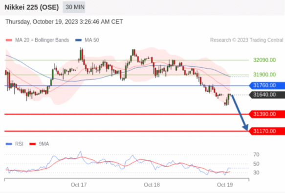 在31760.00之下,看跌,目标价位为31390.00,然后为31170.00。 转折点:31760.00 交易策略:在31760.00之下,看跌,目标价位为31390.00,然后为31170.00。 备选策略:在31760.00上,看涨,目标价位定在31900.00,然后为32090.00。 技术点评:从技术角度上,RI技术指标在50%中性区域下方。 阻力位: 32090