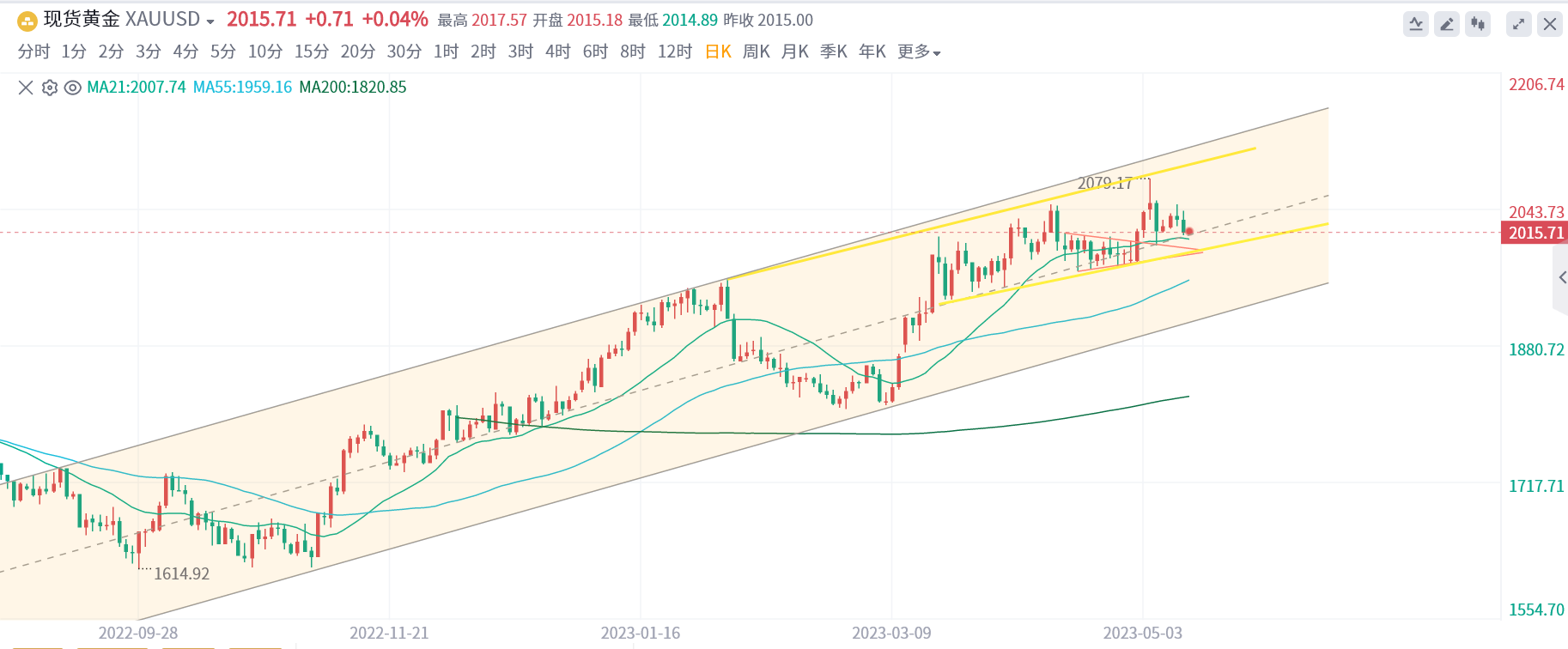 从技术面来看,现货黄金当前在宽度为200美元的上行通道内交易,该通道起点位于去年11月低点,当时金价突破1730美元,确认了三重底形态。由短期利率和收益率为应对银行业危机而下降,引发3月和4月的强劲涨势后,黄金经历了一段时间的盘整,然后在上周涨至历史新高。黄金当前关键支撑位仍在1990-2000区间,其次是1950美元