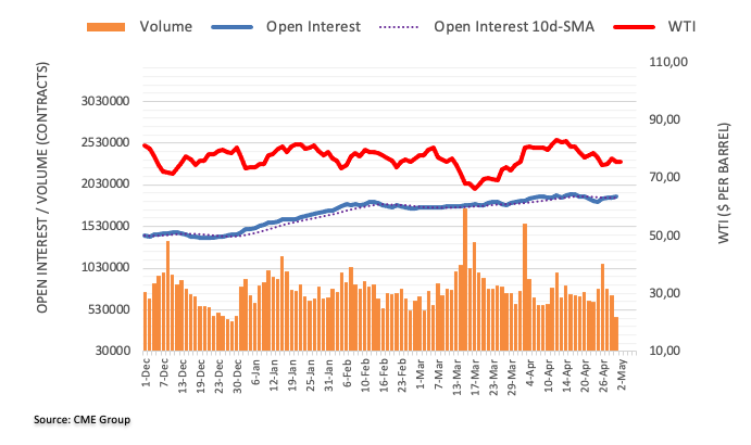 根据芝加哥商业期货交易所集团初步数据,周一原油期货市场未平仓合约连续第四日增长,此次增长约0.43万份合约。另一方面,成交量连续第三日下降,目前下降约26.05万份合约。 WTI原油:下一个上涨目标为80美元 WTI原油逆转两日连跌并於周一走强。油价当日上涨之际未平仓合约增长,支持油价在超短期内继续反弹。对此