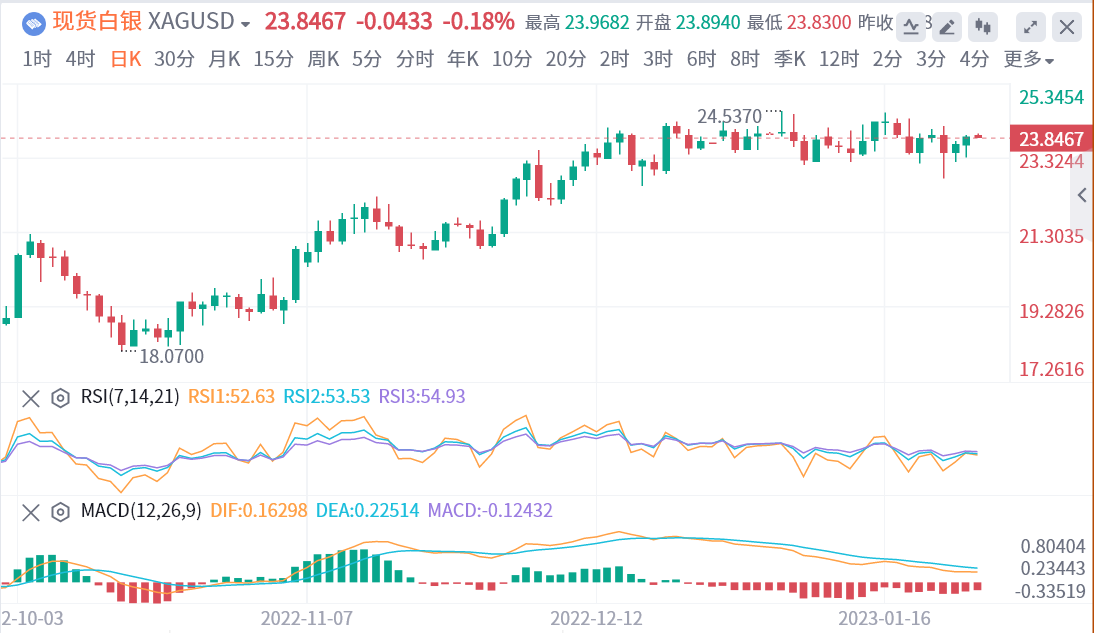 银价在周四亚市轻微调整指向24.00美元的整数水平阻力位。该白色金属大幅上涨,因为调整行情对于白银多头来说可能是健康的。 美元指数周三在102.00附近遇阻下跌并跌至近7个月低点101.10,因为美国GD数据公布之前避险资产的吸引力下降。投资者的风险偏好情绪进一步改善,标普500指数期货在亚市早盘上涨。 银价接近