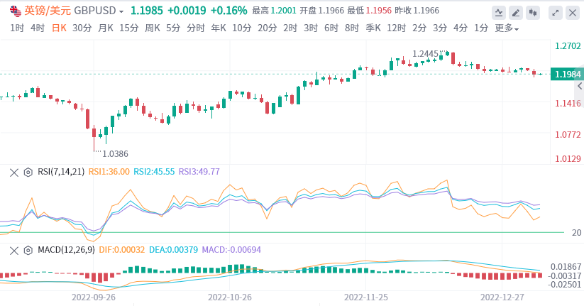 新年第一个交易日,英镑兑美元下破了去年12月下旬以来的盘整区间,并大幅下挫,跌破了去年9月以来的反弹趋势的23.6%回撤位1.1951,预计该货币对有进一步走低至11月低点1.19的空间,该水平之下的支撑看向55日移动均线1.1787/72。不过,我们预计镑美有望在1.19构筑底部,即便下破,首个支撑也先看向1.1825,其次是1.1779/6