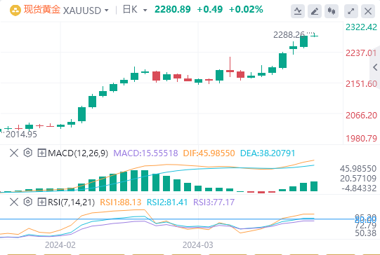 黄金、白银、原油、贵金属4月2日收盘情况: 黄金价格周二再创历史新高。交易员在中东紧张局势加剧的情况下抢购避险资产。 现货黄金周二收盘暴涨29.98美元,涨幅1.33%,收报2280.47美元/盎司。金价盘中最高触及2281.02美元/盎司,再创历史新高。 伊朗指责以色列周一对其驻叙利亚首都大马士革领馆的致命空袭。