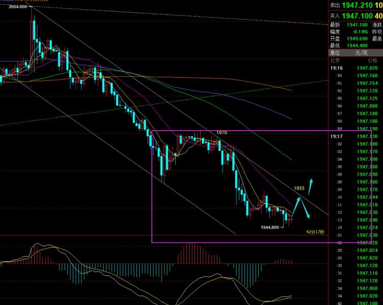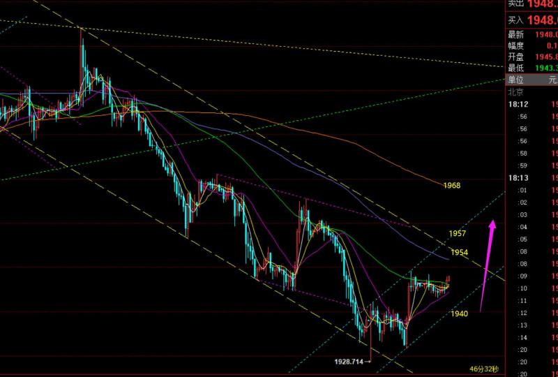 郑氏点银:短暂下跌修复背离,黄金1953上继续看涨,油弱 回顾昨日行情走势及出现的技术点: 第一,黄金方面:昨日亚欧盘直接碎步慢涨,依托凌晨横盘低点1962,涨至1975预期目标;之后,回踩依托日内618分割位置1966再轻仓试探多,通道下轨1959进行轻仓补,均价1963左右,但