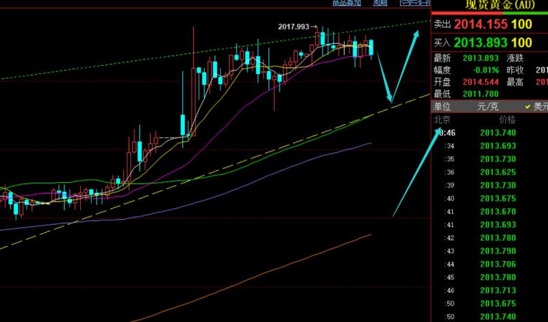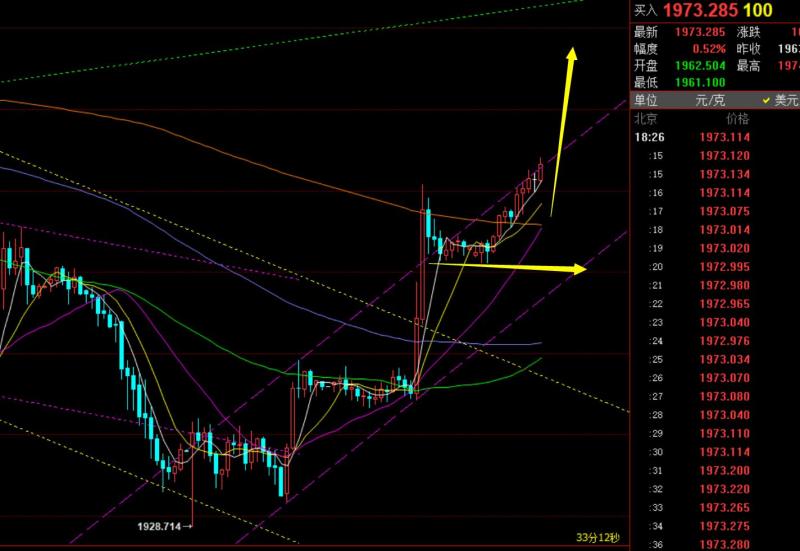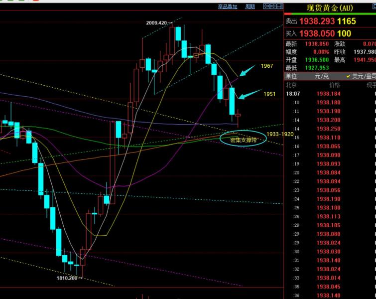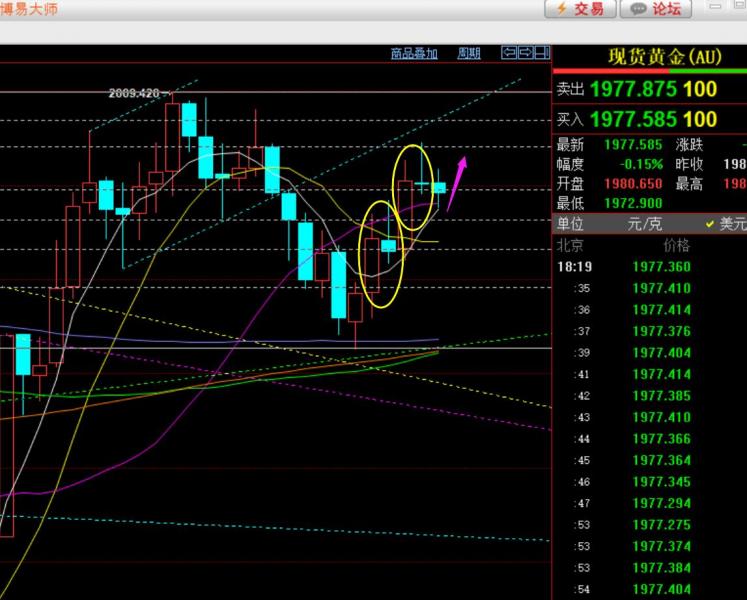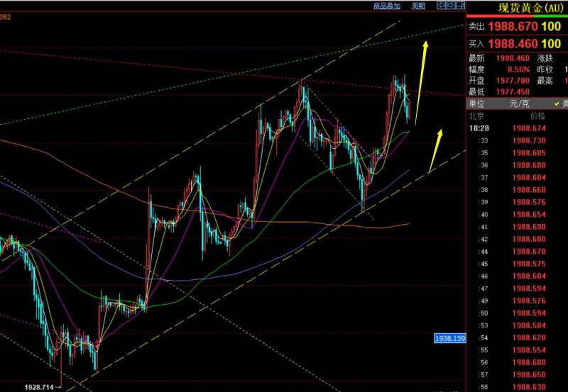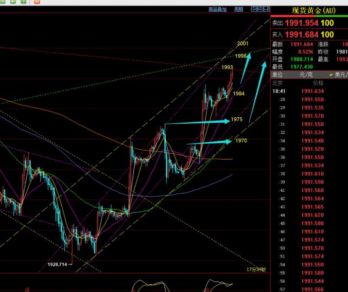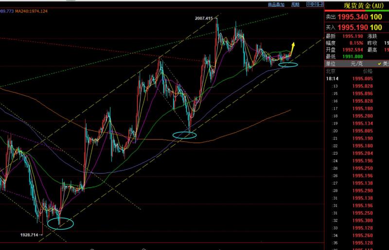 郑氏点银:隔夜黄金成功拉升,今日仍保持看上,油76上看涨 回顾昨日行情走势及出现的技术点: 第一,黄金方面:昨日早间先续跌,给到短期通道支撑,也是周末视频解读中指出的1975支撑点,顺利一波拉升抵达1994高度,拿下一波;而一波拉升走强后