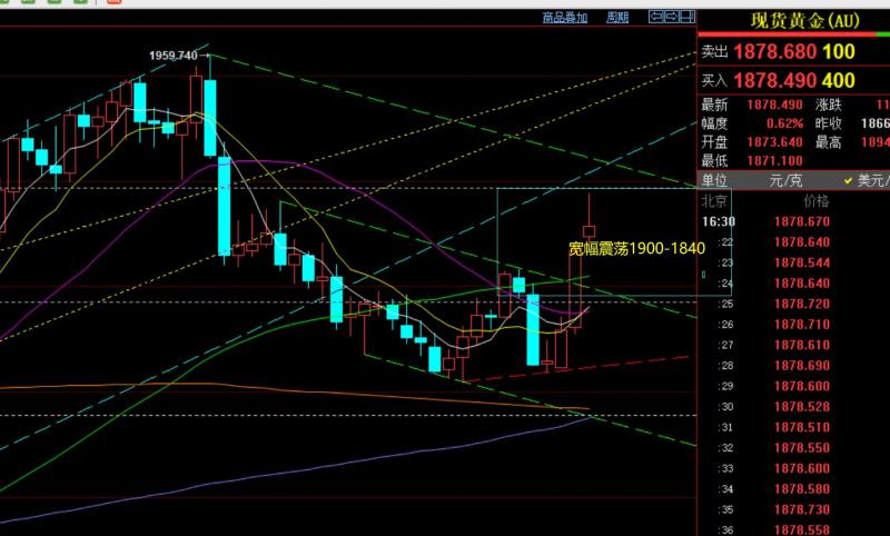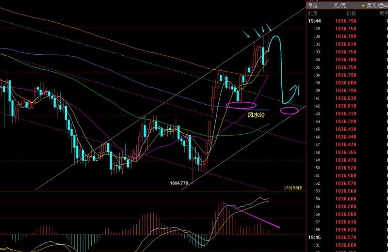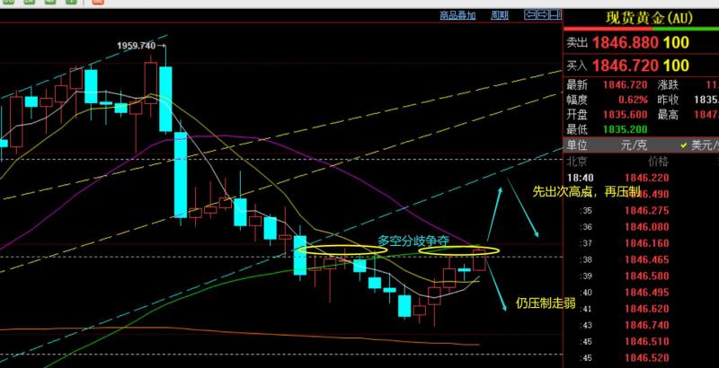郑氏点银:黄金1855下继续承压震荡,原油79.2支撑 回顾昨日行情走势及出现的技术点: 第一,黄金方面:昨日指出黄金突破1847关键节点阻力后,会去出一个次高点再打压下去;而次高点的两个参考点,是根据前两轮不同的高度来划分;一个是1890-1805的618分割位置1858,一个是19