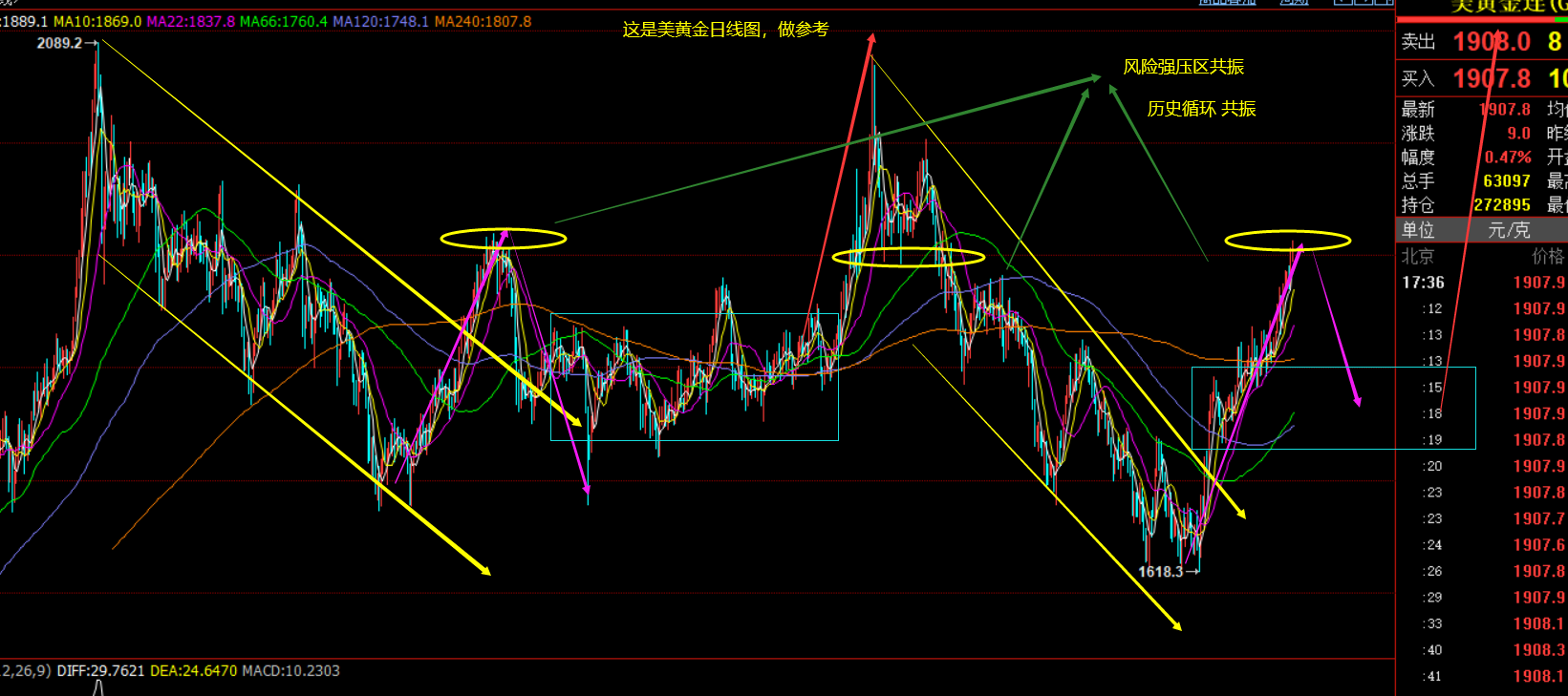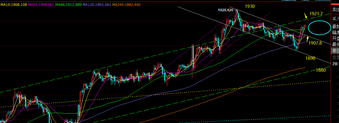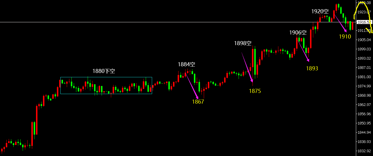 郑氏点银:黄金再次逼空走高,1914上继续高位整理 回顾昨日行情走势及出现的技术点: 第一,黄金方面:昨日早盘先承压1909跌至1900,马上从1900突破1909,小时线底部形成大阳包阴结构,就意味着突破后会有延续上行动能,因此布局1907跟多,同时1910激进加仓了多,因为早间一