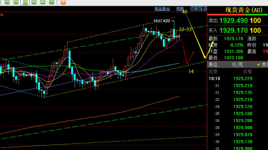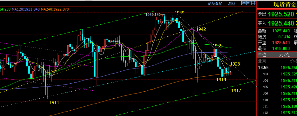 郑氏点银:蓄势待发再摸顶,震荡逼空临尾声 回顾昨日行情走势及出现的技术点: 第一,黄金方面:昨日早盘先拉升一波,承压通道反压1935连跌回测至,这波跌幅拿下,连阴力度不错,欧盘虽有反抽,但只要不破早间高点,美盘仍有二次下探动作,刚好触及日内跌幅618分割阻力再次