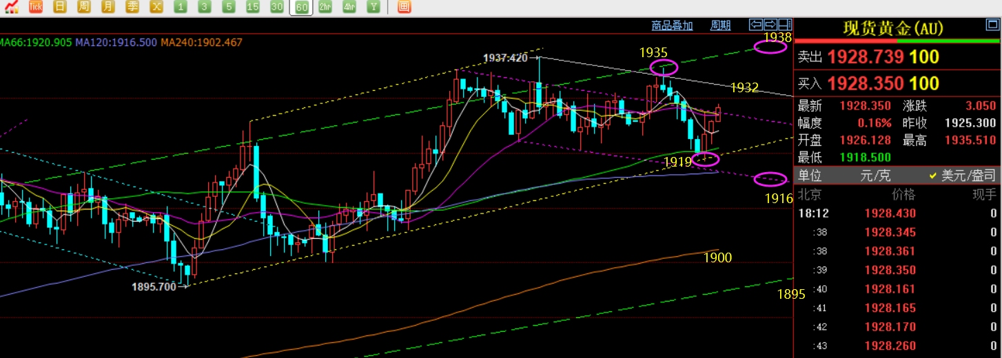 郑氏点银:二次冲高仍未果,黄金先抑后扬仍震荡 回顾上周五行情走势及出现的技术点: 第一,黄金方面:上周五早盘先续涨至1935下承压,而作为震荡行情中,早间续涨或续跌延续性都是较差的,因而容易冲高回落,而当破位小时线10均线有效后,则提示短空跟随,只