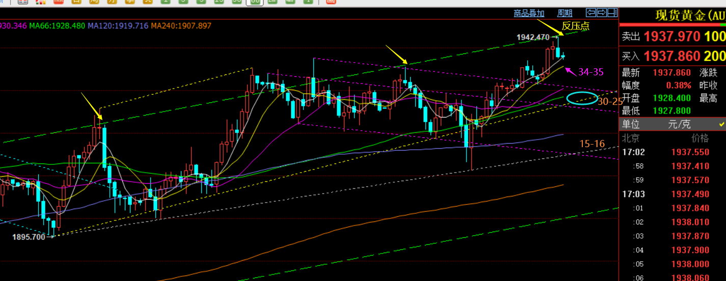 郑氏点银:短期多空即将见分晓,黄金1935成风水岭 回顾昨日行情走势及出现的技术点: 第一,黄金方面:昨日又是循环运用常见技术点:当隔夜持续拉升后,早盘先小幅冲就是首次高空时机,因为震荡行情中早间延续性是较差的;其次,当小时线有效破位10均线,则隔