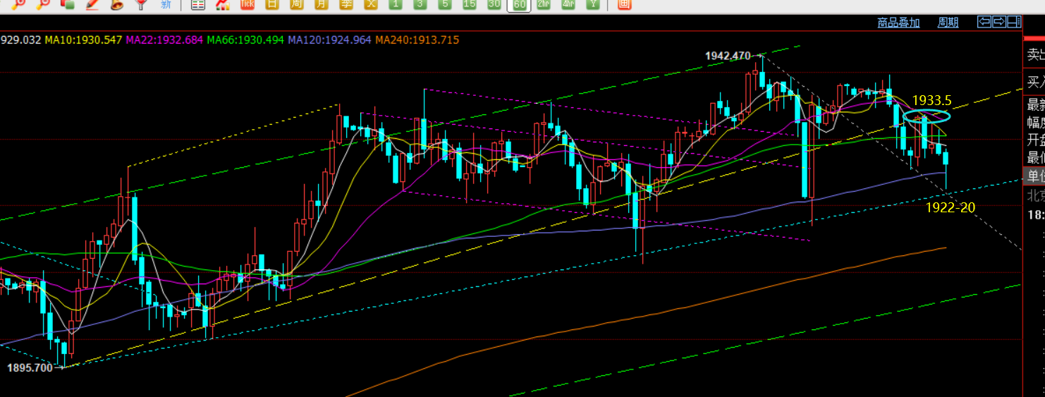 郑氏点银:黄金日线反复回测拉升,10均线得失是关键 回顾昨日行情走势及出现的技术点: 第一,黄金方面:昨日早盘先成功续涨一波,在震荡行情中能成功一早延续的概率还是相对不高,欧盘承压1942-43一线通道反压,提示一旦刺破前高容易压制走跌,而当小时线10