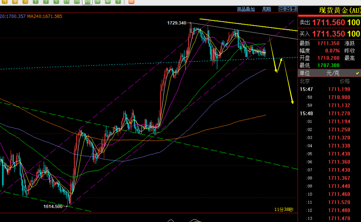 郑氏点银:黄金1700上继续压制走低,原油88.7上偏强运行 回顾上周五行情走势及出现的技术点: 第一,黄金方面:上周五非农公布前,价格整体波幅不大,卡在1712-1707仅5美金上下反复横盘,就没参与的价值;而数据公布利空黄金,价格急跌失守1707关键趋势通道支