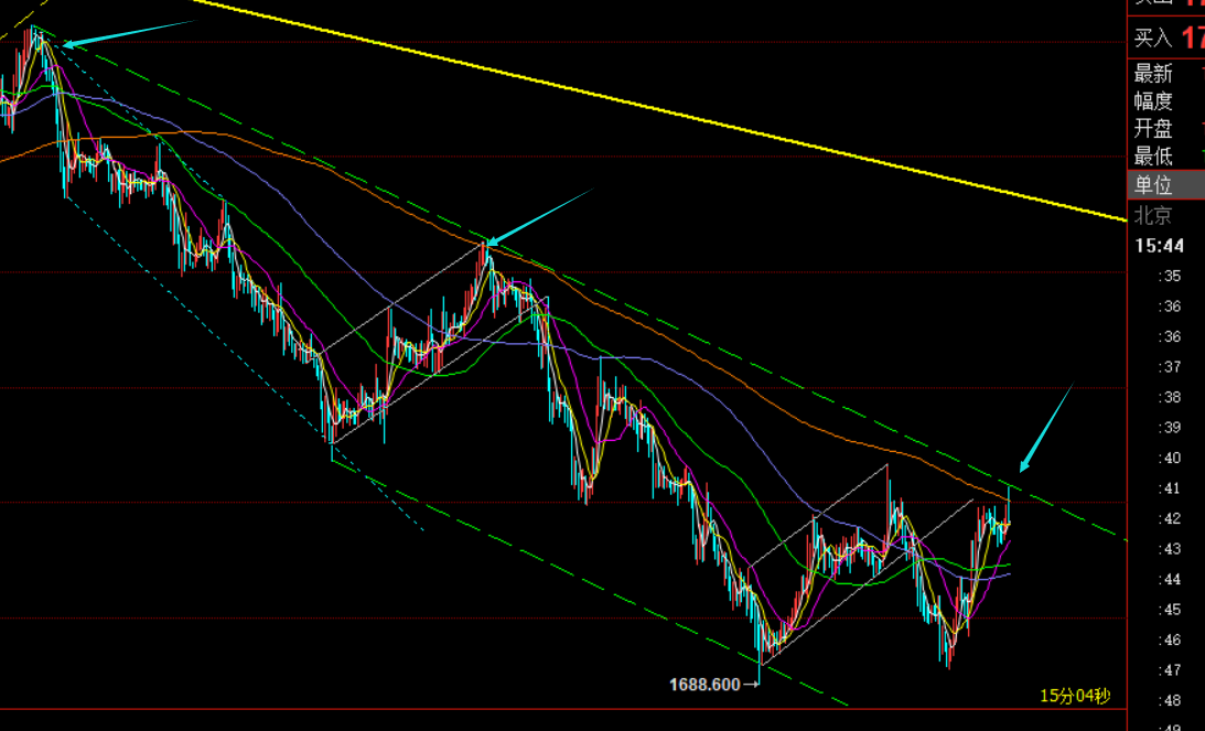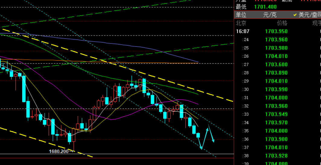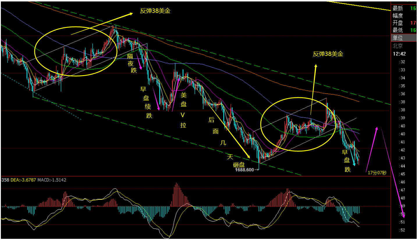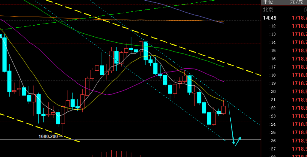 郑氏点银:黄金短线仍弱势下跌,原油88一线关注得失 回顾昨日行情走势及出现的技术点: 第一,黄金方面:昨日午后承压凌晨高点1727直接走弱,欧盘连跌破底,则美盘反弹二次弱势跟空,首先选择的入场点通道反压,也是382分割阻力共振点,即1716