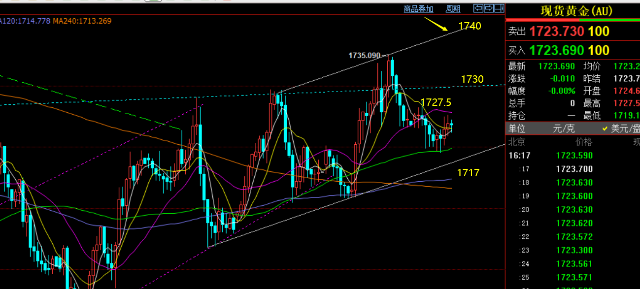 郑氏点银:黄金1723下仍处于下跌通道,原油走极弱下跌 回顾昨日行情走势及出现的技术点: 第一,黄金方面:昨日早间续跌,午后探底拉升,美盘前承压下滑,这些还算符合预期,和前面的走势循环基本雷同,不同的是美盘出现的拉升力度比上一次过大,到现在价格,
