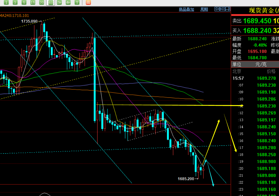 郑氏点银:黄金非农前仍先看压制,原油关注89.6风水岭 回顾昨日行情走势及出现的技术点: 第一,黄金方面:昨日早间直接连跌破位,继续续跌,那么午后小幅反弹1706直接继续做空,最终到位1690一线目标,此位置属于下跌通道下轨支撑处,触及逢低多参与试探,夜间拉升1