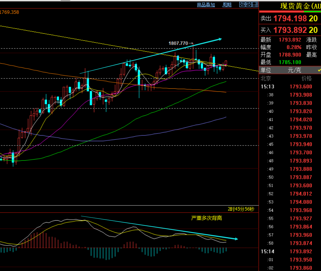 郑氏点银:黄金多空仍反复不定,原油再度走弱 回顾昨日行情走势及出现的技术点: 第一,黄金方面:隔夜冲高走跌,日内依托618分割阻力1793下承压去布局短空,加之4小时级别仍处于严重背离,抵达1785一线同时盈利减持,包括隔夜1798下空;欧盘处于压制跌,但美盘依然还是不破