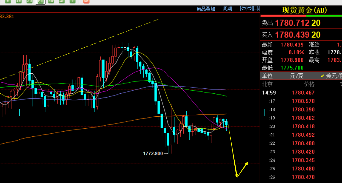郑氏点银:黄金1784下仍处于压制,原油还有一波走弱 回顾昨日行情走势及出现的技术点: 第一,黄金方面:昨日先依托凌晨阻力1782下继续看压制跟空,最终到位1772一线目标;由于欧盘整体处于弱势无力反弹,同时也破了新低,虽产生了一定底背离状态,但横盘不上