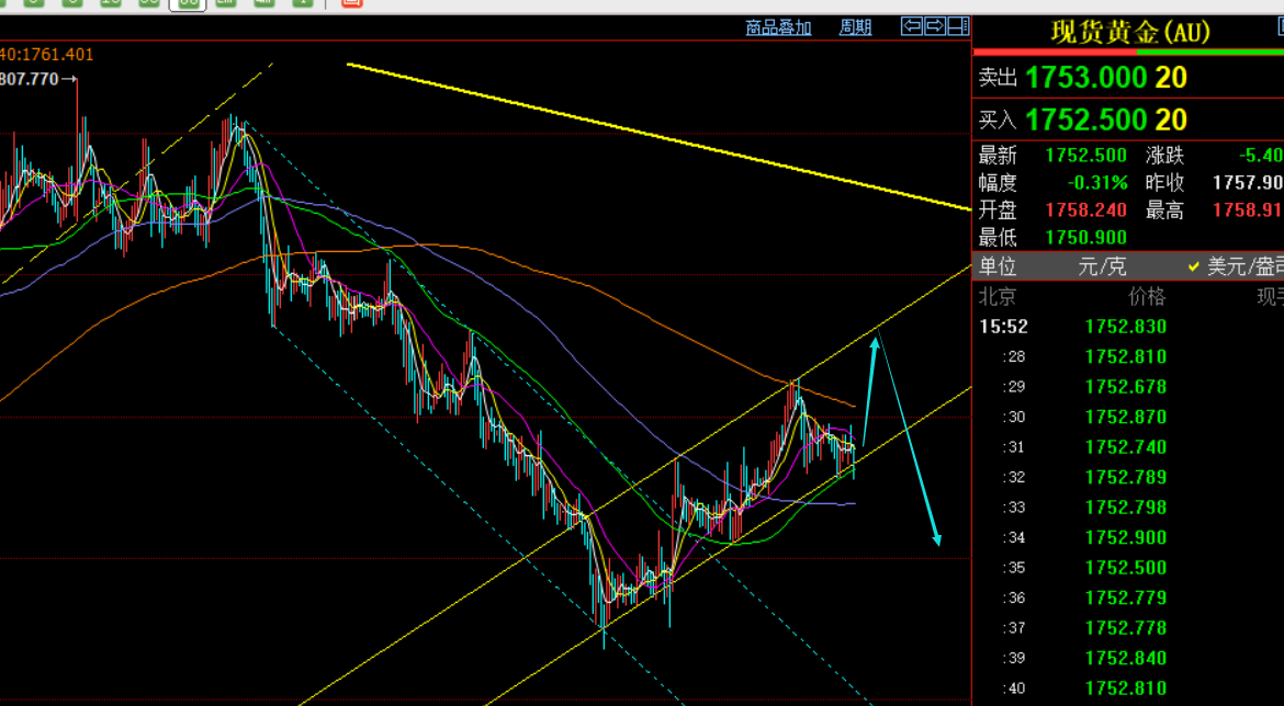 郑氏点银:黄金弱势持续压制,原油有望第三次循环产生 回顾上周五行情走势及出现的技术点: 第一,黄金方面:上周四隔夜连跌走弱失守1760一线关键支撑,周五日内亚欧盘直接震荡慢续跌,而美盘先难得出现小幅急拉,则视为诱多给高空机会,果断通知1755直接提前空,1761风水岭节点