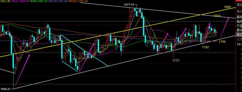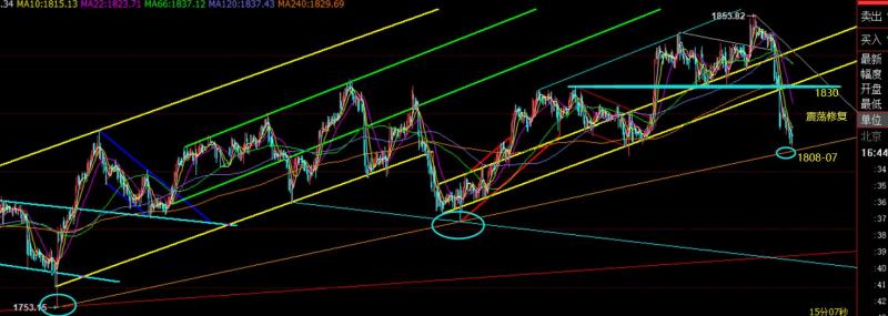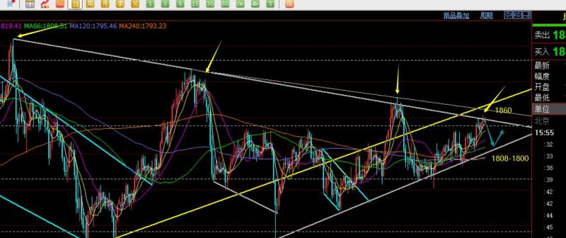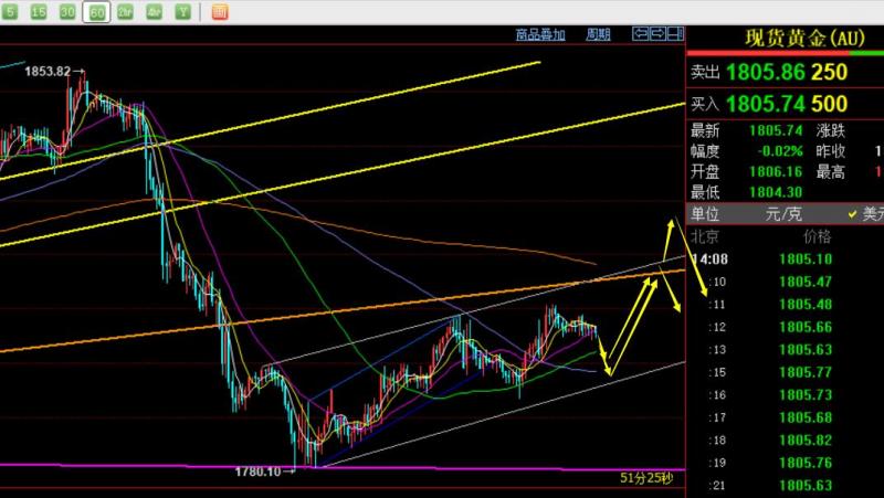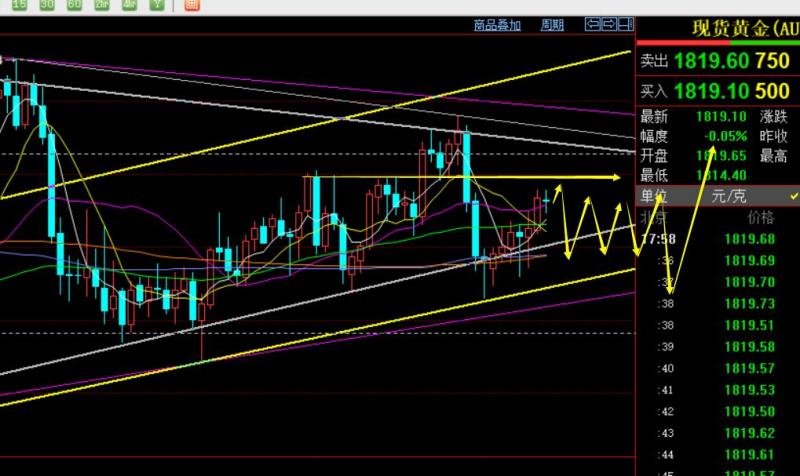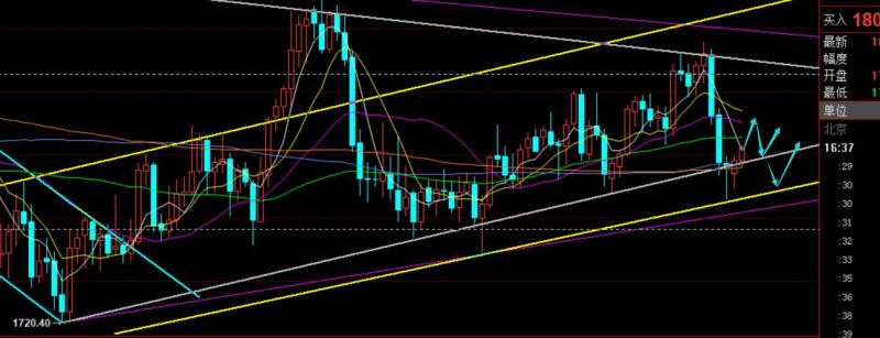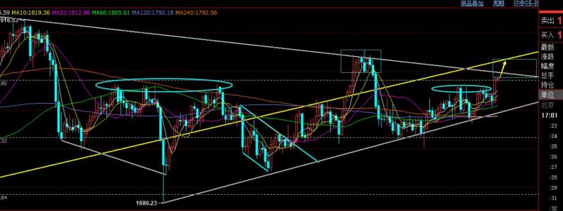 郑氏点银:黄金维持底部偏弱整理,原油短期开始回调 回顾上周五行情走势及出现的技术点: 第一,黄金方面,上周四隔夜洗盘探底上攻收盘于日内高位,则第二日一般有延续反弹动能,因此给出1803上直接多,不能等回测多,抵达1814收割一波,此位置处于通道的上轨
