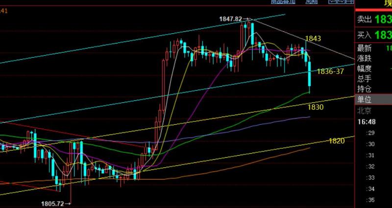 郑氏点银:黄金关注1830支撑,原油调整后继续涨 回顾昨日行情走势及出现的技术点: 第一,黄金方面,周三隔夜大幅拉升,且破位1830走强一波,对于周四早盘来讲,首先是博续涨,不等太多回测,可惜力度并不大,只触及1844;其次,作为极强大幅拉升之后,可回踩236分割位置183