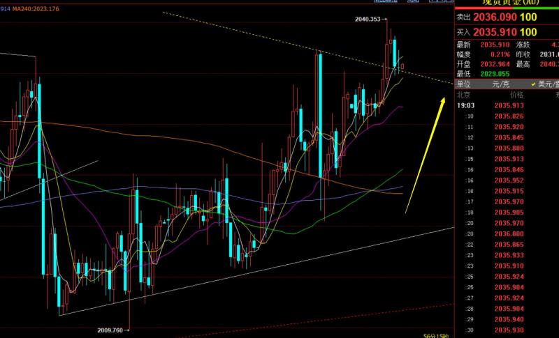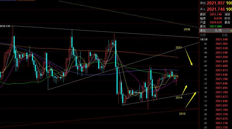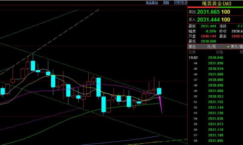 郑氏点银:黄金短期仍处于下跌调整状态,原油反复拉低看涨 回顾上周五行情走势及出现的技术点: 第一,黄金方面:上周五亚欧盘是一路震荡慢涨走高,当2023通道反压点无法阻挡时,就认为下一个承压点要关注2040一线,它是处于2062-2002反抽618分割阻力,也是2062-2058前高趋