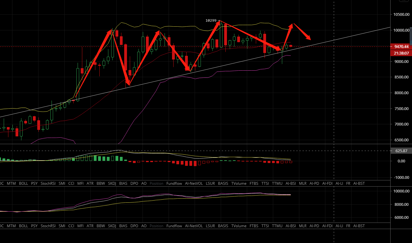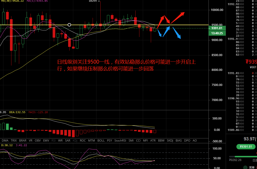 凌姗赠言:投资的路很漫长,要学会淡然,市场往往技术与消息是充满矛盾的,少说话,多倾听。无论你今天怎么用力,明天的落叶还是会飘下来,无常是资本市场的一种常态,要学着习惯适应。K线的涨涨跌跌在时钟的滴答声中飞速流逝 【行情回顾】 行情自昨日凌晨向上方拉升,受制于9500压制开始回落,随后