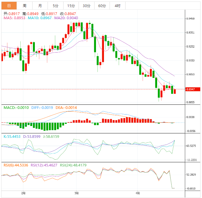 周五盘中,美元兑瑞郎上涨至0.8948,涨幅0.34%。 基本面上,美元兑瑞郎在触及一周高点0.9003后逆转走势,随后下跌,因为卖家仍致力于捍卫0.9000这一数字。在连续几天在0.8950-0.9000区间盘整之后,美元兑瑞郎在0.8933交投,下跌0.45%。美元兑瑞郎连续两天走高,并在转为下跌之前的一周内保持在高位。正如相对强弱指数