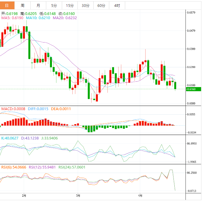 周四盘中,纽元兑美元下跌至0.6160,跌幅0.66%。 基本面上,纽元/美元面临巨大的抛售压力,并跌至0.6150-0.6145区域,或超过一个月低点,以应对新西兰消费者通胀数据的疲软。然而,纽元/美元削减了部分盘中跌势,并在欧洲早盘时段反弹至0.6175-0.6180区域。 技术面上,纽元兑美元今天以明显的负面走势开盘,接近我