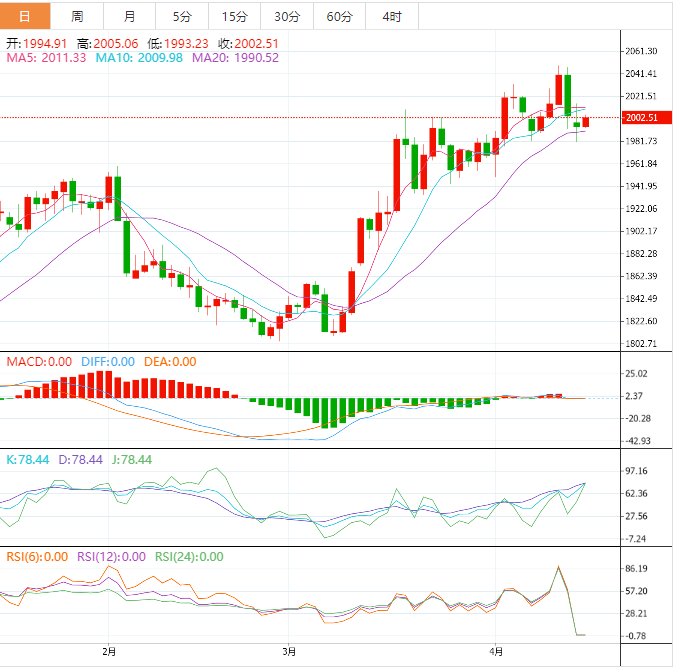 周二盘中,现货黄金震荡微涨,目前交投于2001.46美元/盎司附近,中国最新的经济数据普遍好于预期,打压美元的避险买需,美元的小幅回调,帮助金价反弹。不过,市场对美联储5月加息的预期达成共识,料将限制美元的回调空间,美债收益率守在数周高位,料将令金价短线面临进一步下行风险。而且黄金的避险买需也受到一些削弱