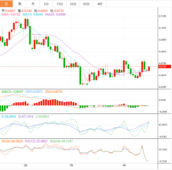 周二盘中,澳元兑美元上涨至0.6735,涨幅0.50%。 澳元基本面:周二公布的4月澳储行会议纪要显示,澳储行不加息的决议是艰难得出的,儘管移民意外激增和为公职人员加薪为採取更多措施提供了理由。最后,委员们认为最好暂时维持利率政策不变,并评估已经实施的急剧加息350个基点所带来的影响,这显然有助于冷却消费需求