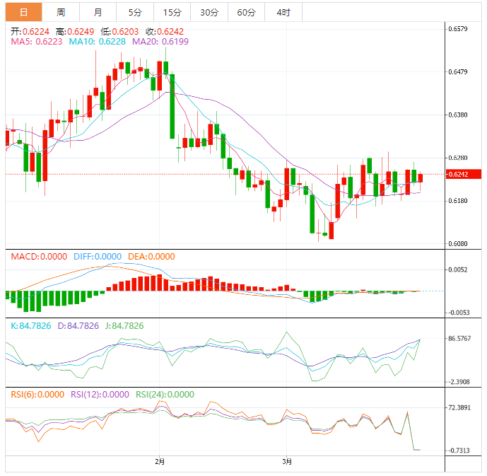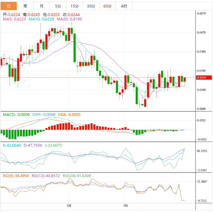周四盘中,纽元兑美元上涨至0.6245,涨幅0.34%。 基本面上,纽元/美元跌至0.6200,同时延续了前日自周线高点回撤。在这期间,纽元/美元验证美元全盘走强及新西兰经济数据好坏参半。新西兰2月营建许可下降9.0%,而预期是上升0.5%,前值-5.2%。然而,澳新银行集团(AZ)3月份信心指数有所回升,但录得负值,未能吸引纽元