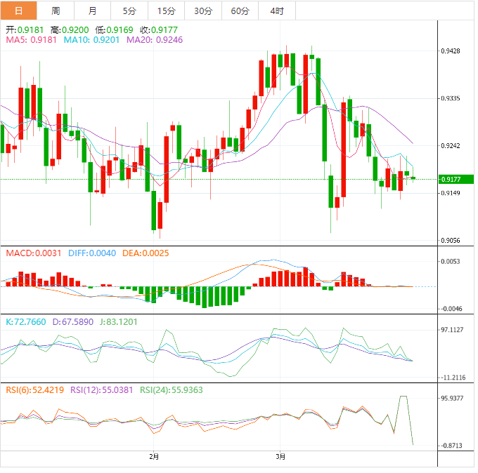 周四盘中,美元兑瑞郎下跌至0.9179,跌幅0.01%。 基本面上,美元/瑞郎多头重新回到了谈判桌前,在最近几个交易日,瑞士信贷银行倒闭使瑞郎维持疲弱,因为瑞郎失去避险吸引力。看来,瑞士国家银行释放鹰派措辞旨在找回其荣耀。周三发布瑞士国家银行季度公报证实,瑞士国家银行主席乔丹(ThoaJ.Jorda)将进一步加息