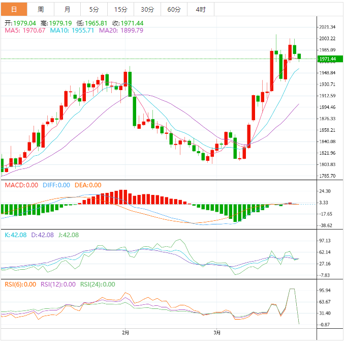 黄金价格接近1975美元,保持在一个星期前的对称三角形内,因为金价在周一早些时候努力寻找明确的方向。这样一来,金价延续了前一周的跌势,这是四周来的首次跌势,原因是市场的谨慎乐观情绪,以及美国国债收益率的低迷。 市场参与者目前正期待周五公布的美国个人消费支出(C)数据。2月份核心个人消费支出预计将环比