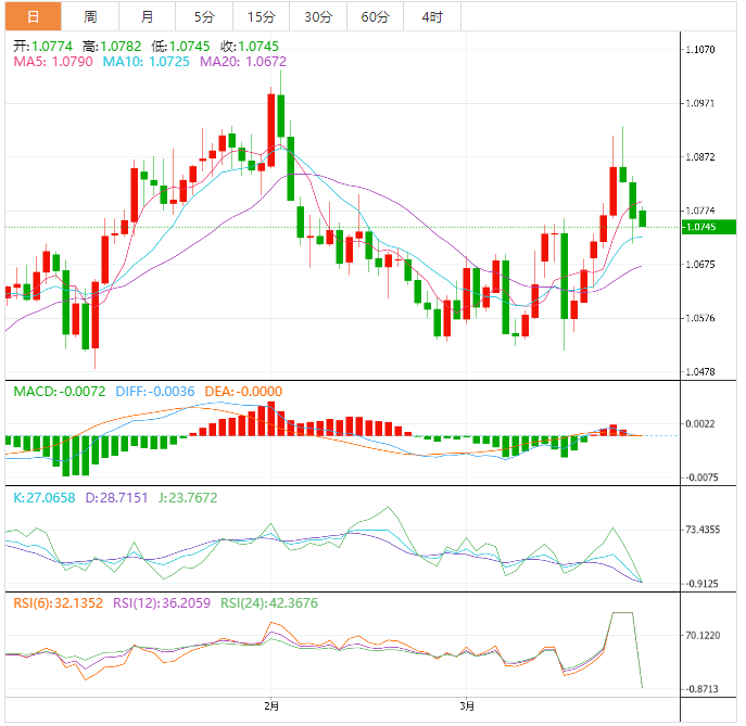 周一盘中,欧元兑美元下跌至1.0746,跌幅0.13%。 欧元基本面:欧元/美元震荡于在1.0800下方。儘管标普全球採购经理人指数初值向好,且美国扩大了对美国中型银行的金融支持,但美元指数(DXY)仍难以扩大上行空间,欧元/美元跟随低迷的美元指数转为盘整。在欧元区,由于通货膨胀飞速飙升,家庭正面临著巨大的压力。据
