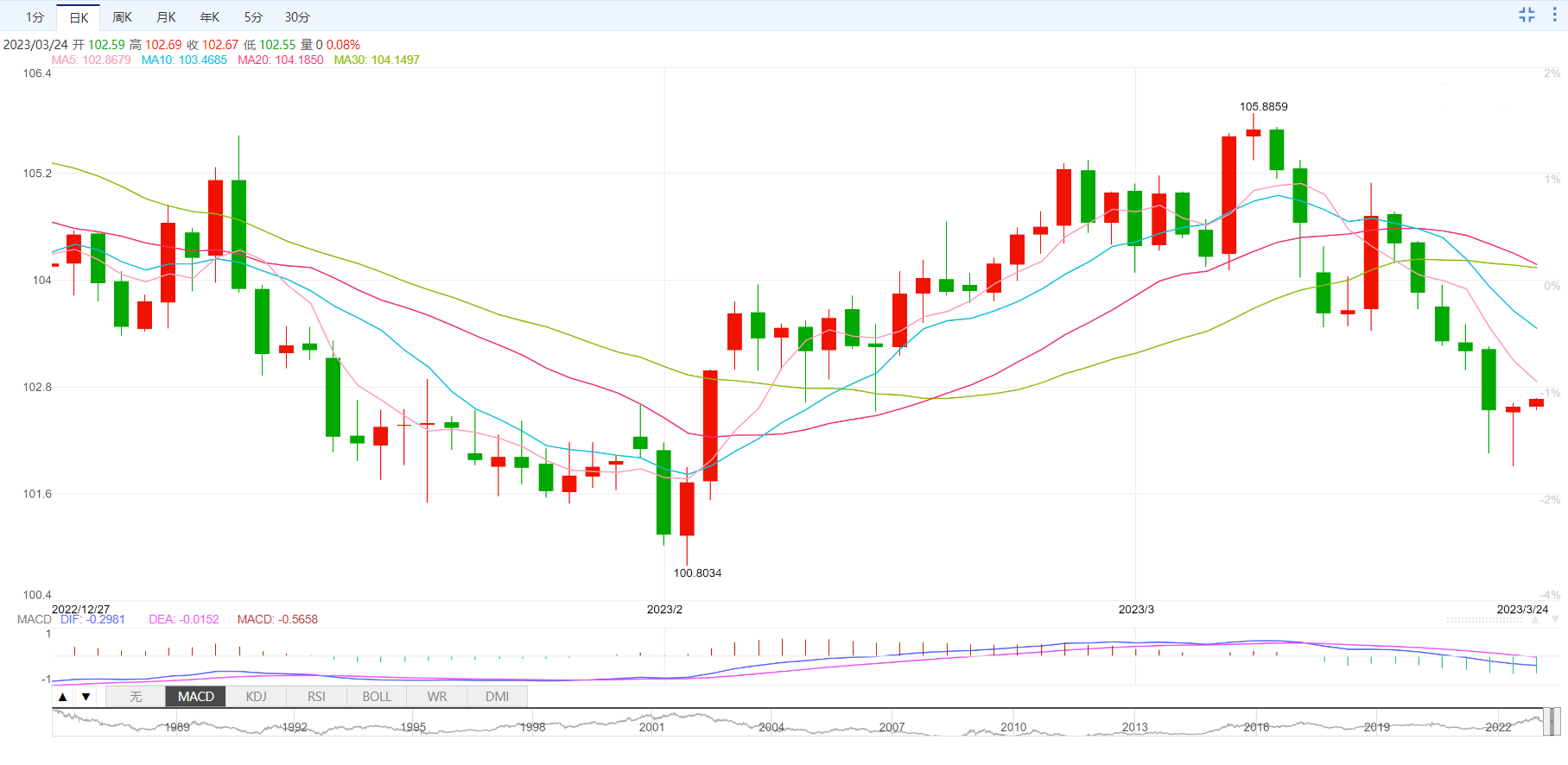 今日外汇市场走势分析 周五盘中,美元指数窄幅震荡,目前交投于102.66附近。在连续五个交易日下跌后,美元指数周四探底回升,尽管美国联邦储备理事会美联储发出了接近于停止加息的声音,而瑞士央行和英国央行则推进了进一步加息,但对银行业的担忧仍给美元提供避险支撑。 美元指数周四盘中一度下跌0.6%,创近一个