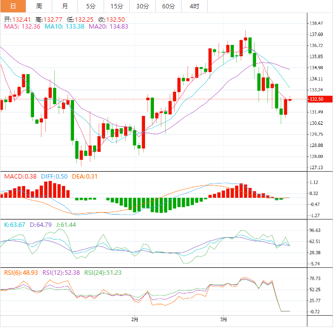 周三盘中,美元指数下跌至103.17,跌幅0.03%;欧元兑美元上涨至1.0770,涨幅0.02%;英镑兑美元上涨至1.2228,涨幅0.10%;美元兑日元下跌至132.45,跌幅0.01%;澳元兑美元上涨至0.6698,涨幅0.41%。 美元兑日元守住隔夜涨幅,风险偏好回归带来支撑 美元兑日元周三仍在亚洲盘受到支撑,因为危机疑虑缓解,股市上涨。