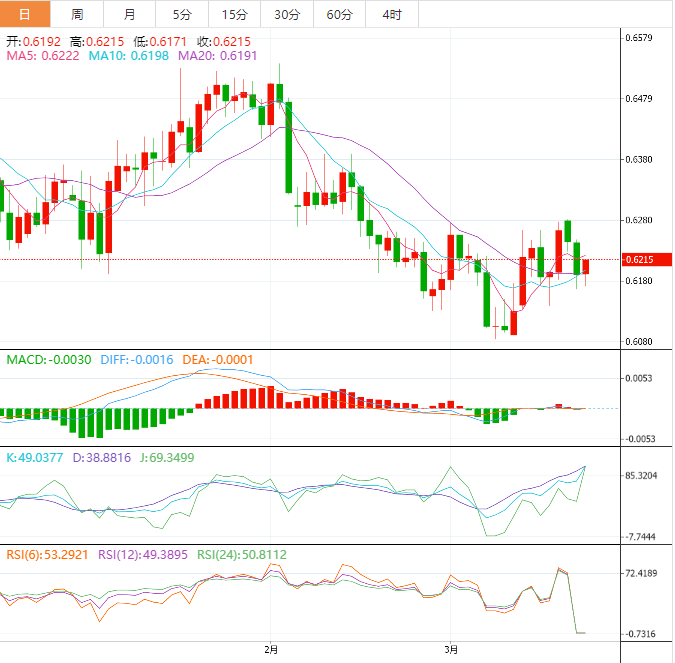 周三盘中,纽元兑美元上涨至0.6216,涨幅0.37%。 基本面上,纽元/美元自0.6170开始持稳反弹。周二,市场再度担忧新西兰经济增长乏力,纽元/美元仍处于弱势。新西兰经济经历洪灾后正艰难复苏,导致大量流动性涌入新西兰,经济增长疲弱。然而,纽储行(RZ)将继续上调官方现金利率(OCR),以降低持续高企的通货膨胀。