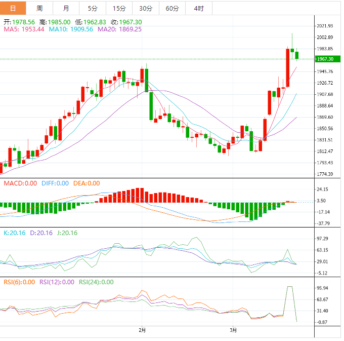 周二盘中,现货黄金窄幅震荡,目前交投于1981.38美元/盎司附近,临近美联储利率决议,市场观望情绪较浓,整体交投比较清淡,虽然短线避险情绪有所回落,但是金价仍受到逢低买盘的支撑,因为欧美银行业的动荡,令市场对美联储的终端利率有所下降,高盛预计美联储本周可能会维持利率不变,金价的中长线看涨预期较强。