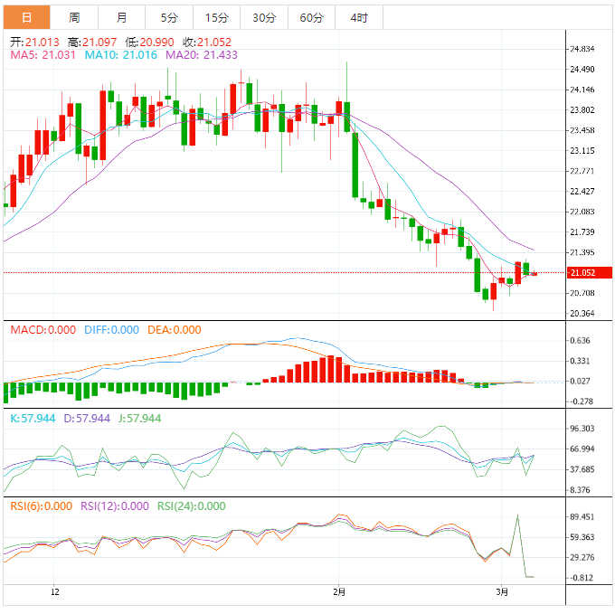 白银价格未能延续上周五的涨势,从约21.30美元的周高点回落,并在周一下跌0.92%或0.20美分。截止目前,白银价格为21.02美元,低于其开盘价。 日线图所示,银价偏向下行。在测试2月17日的日低点21.18美元后,白银现货价格下跌,空头瞄准20.00美元。然而,在向南的过程中,白银需要突破21.00美元的障碍。一旦移除