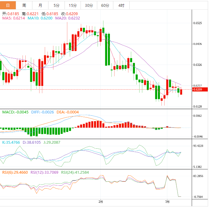 周二盘中,纽元兑美元上涨至0.6211,涨幅0.23%。 基本面上,纽元/美元在周二吸引了一些买盘,并延续隔夜自技术上重要的200日简单移动平均线(A)的反弹走势。该货币对在欧洲早盘时段维持其积极基调,目前位于日高附近,略高于0.6200整数关口。本周投资者还将面对周五公佈的备受关注的美国月度就业细节,即俗称的非