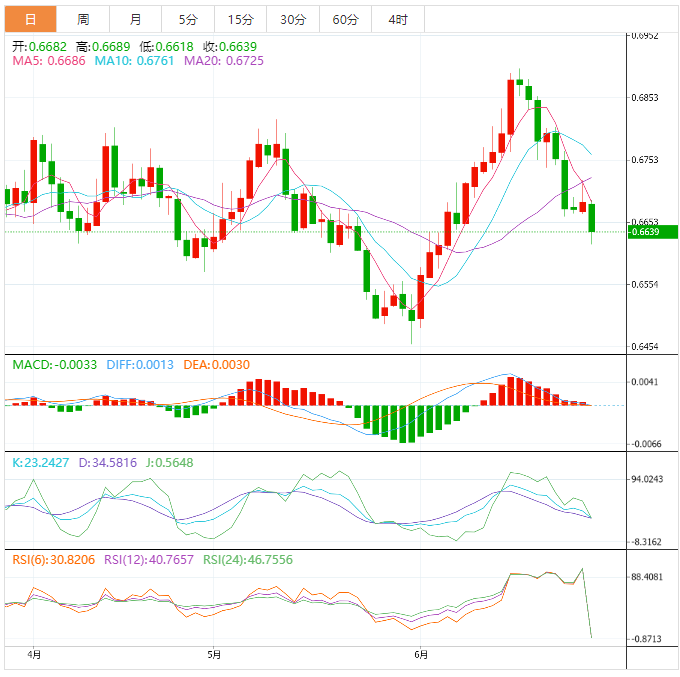 周三盘中,澳元兑美元下跌至0.6640,跌幅0.70%。 澳元基本面:澳元/美元回落至澳大利亚通胀数据公佈后的三週低点,因为在欧洲央行(C)辛特拉论坛上关键央行行长的讲话之前,市场情绪仍然很不确定。尽管如此,在周三欧洲市场早盘,澳大利亚月度消费者价格指数(CI)吸引空头后,澳元兑美元暴跌50点至0.6618,当日下跌