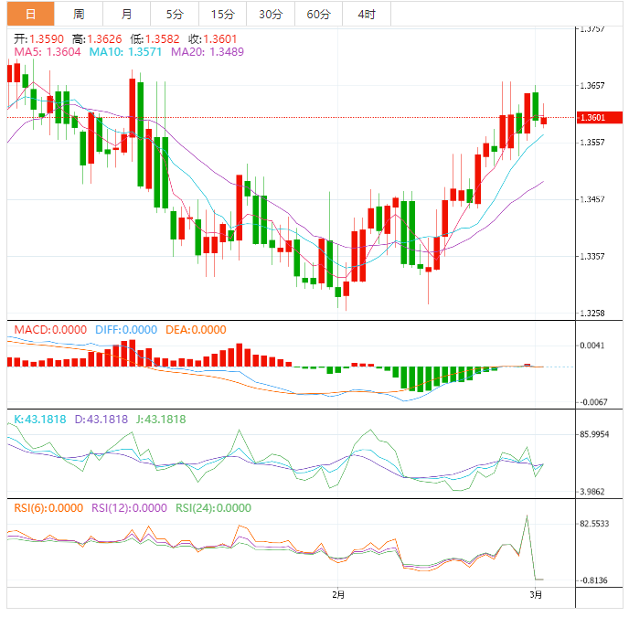 美元兑加元在创下三周以来最大单日跌幅后,保持在1.3600附近的较低水平,因为在周四低迷的亚洲市场,加元对交易员努力分析各种催化剂。 周三的大幅下跌可能与市场的乐观情绪有关,也与加拿大经济活动数据的公布有关。加拿大的主要出口商品——石油价格走强加剧了下行偏见。 周二美国数据疲软,周三中国2月采购经理