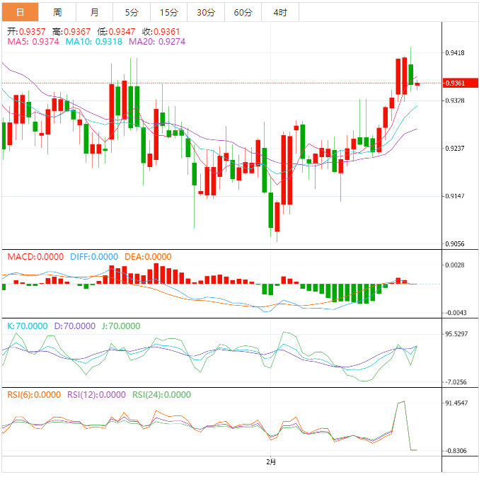 周二亚洲时段,美元兑瑞郎从0.9420上方大幅回调后,汇价正在0.9350附近建立中间缓冲位。在瑞士第四季度国内生产总值(GD)和美国I制造业I数据发布之前,瑞郎资产预计将横盘。 按年率计算,预计瑞士GD将收缩1.2%,而此前公布的数据为扩张0.5%。根据共识,瑞士经济在第四季度将增长0.3%,高于第三季度0.2%的增长。
