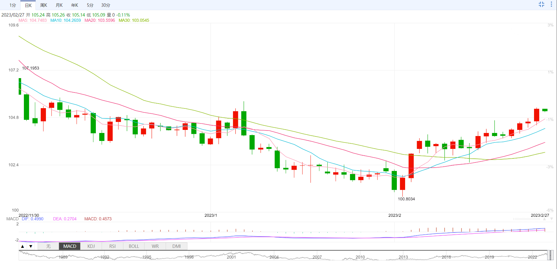 周一亚洲时段,美元指数盘整了自1月初以来的最高水平,在105.15附近小幅下跌。尽管如此,美元兑六种主要货币的指数在上周创下了自2022年9月以来的最大单周涨幅,并出现了为期四周的上涨趋势,之后从1月初的2023年峰值回落。 美元指数多头欢呼美联储的鹰派押注,以及围绕中国和俄罗斯的地缘政治担忧,刷新了多日高点。